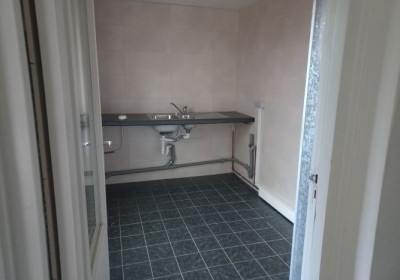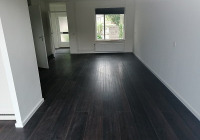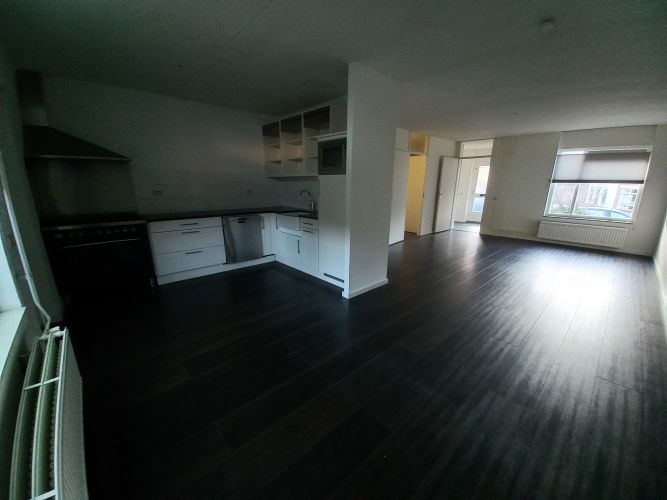 - L-vormige doorzon woonkamer met halfopen keuken (totaal 37 m2) met laminaatvloer en toegang naar hal met meterkast.