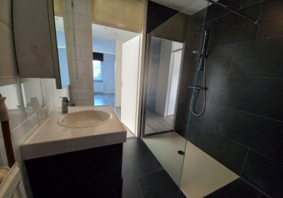 - Geheel betegelde badkamer (ca. 2.61 x 2.20 m) met tegelvloer, inloopdouche v.v. douchescherm, badmeubel met vaste wastafel en 2e toilet. Tevens bergruimte in achterwand.