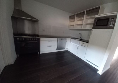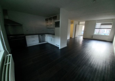 - L-vormige doorzon woonkamer met halfopen keuken (totaal 37 m2) met laminaatvloer en toegang naar hal met meterkast.