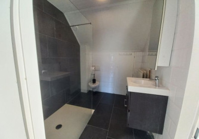 - Geheel betegelde badkamer (ca. 2.61 x 2.20 m) met tegelvloer, inloopdouche v.v. douchescherm, badmeubel met vaste wastafel en 2e toilet. Tevens bergruimte in achterwand.