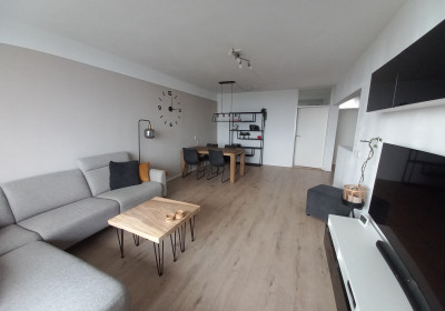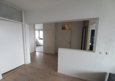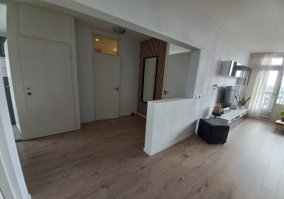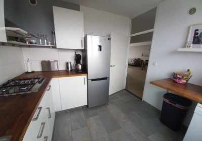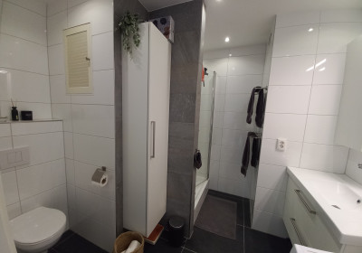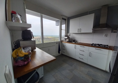 Indeling: Entree met meterkast, Overloop (+/- 2 x 4 m) met inpandige bergkast, Aan de linkerzijde gesloten keuken (+/- 9m2) met aanrecht, gasfornuis en afzuigkap. Tevens aansluitingen voor vaatwasser of wasmachine. Sfeervolle woonkamer (+/- 7.16 x 3.88 m) met vergezicht over o.a. Brunssum en Landgraaf. Van voormalige 2 slaapkamers is 1 slaapkamer(+/- 23 m2) gemaakt met roomdivider waardoor je een grote slaapkamer hebt met kast en ingebouwde boiler. Tevens met toegang tot het balkon. De betegelde badkamer voorzien van wastafel met spiegel en verlichting, douche, hangend toilet en wasmachine aansluiting. De 2e slaapkamer (+/- 19 m2) aan de galerij zijde voorzijde is ook voorzien van laminaat. Het instapklare appartement is voorzien van dubbelglas behoudens bovenluiken, rolluiken op zowel slaapkamers en keuken. Een hordeur naar het balkon en op diverse ramen. Zoals eerder gezegd is er een balkon over de hele breedte van het appartement. Aan het einde van de galerij is er tevens een ruime berging. Een modern appartement wat het bekijken de moeite waard is.